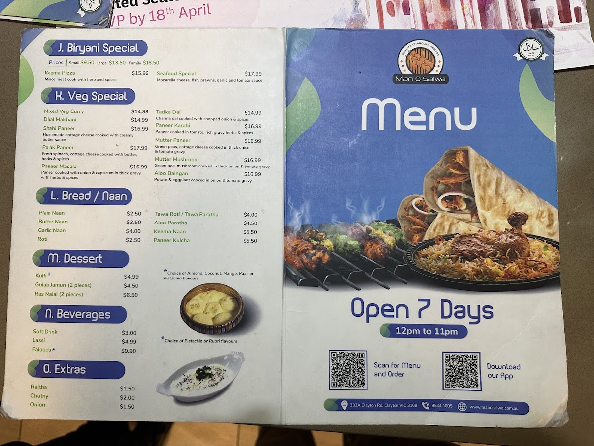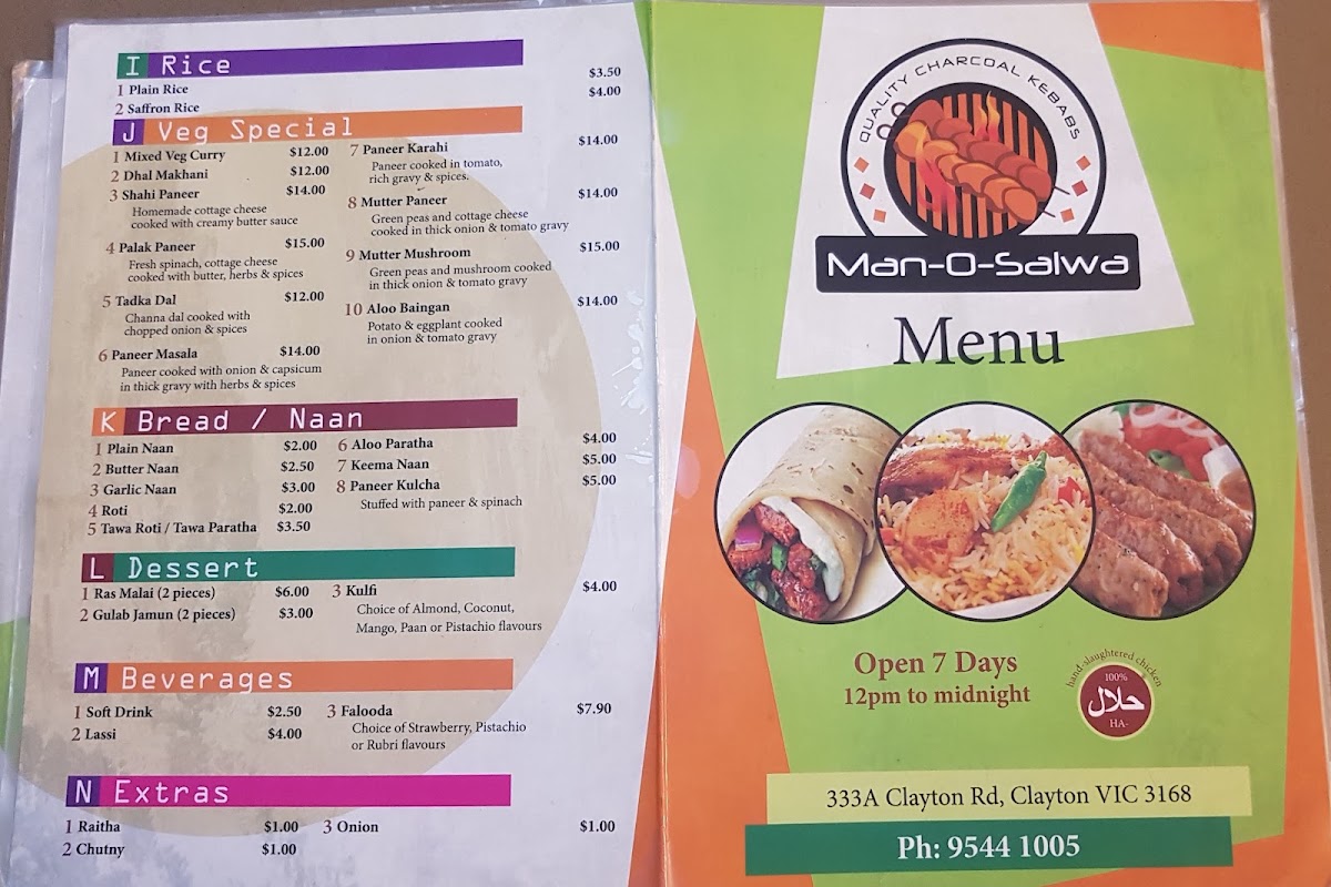 At Man-O-Salwa Menu, you'll discover a delightful fusion of flavors that capture the essence of traditional and contemporary cuisine. Located at 348-350 Clayton Rd, Clayton VIC, this charming spot brings a fresh twist to classic dishes, offering something for everyone. Whether you’re in the mood for a comforting bowl of soup or craving something with a bit more spice, there’s a dish that will surely satisfy your appetite.