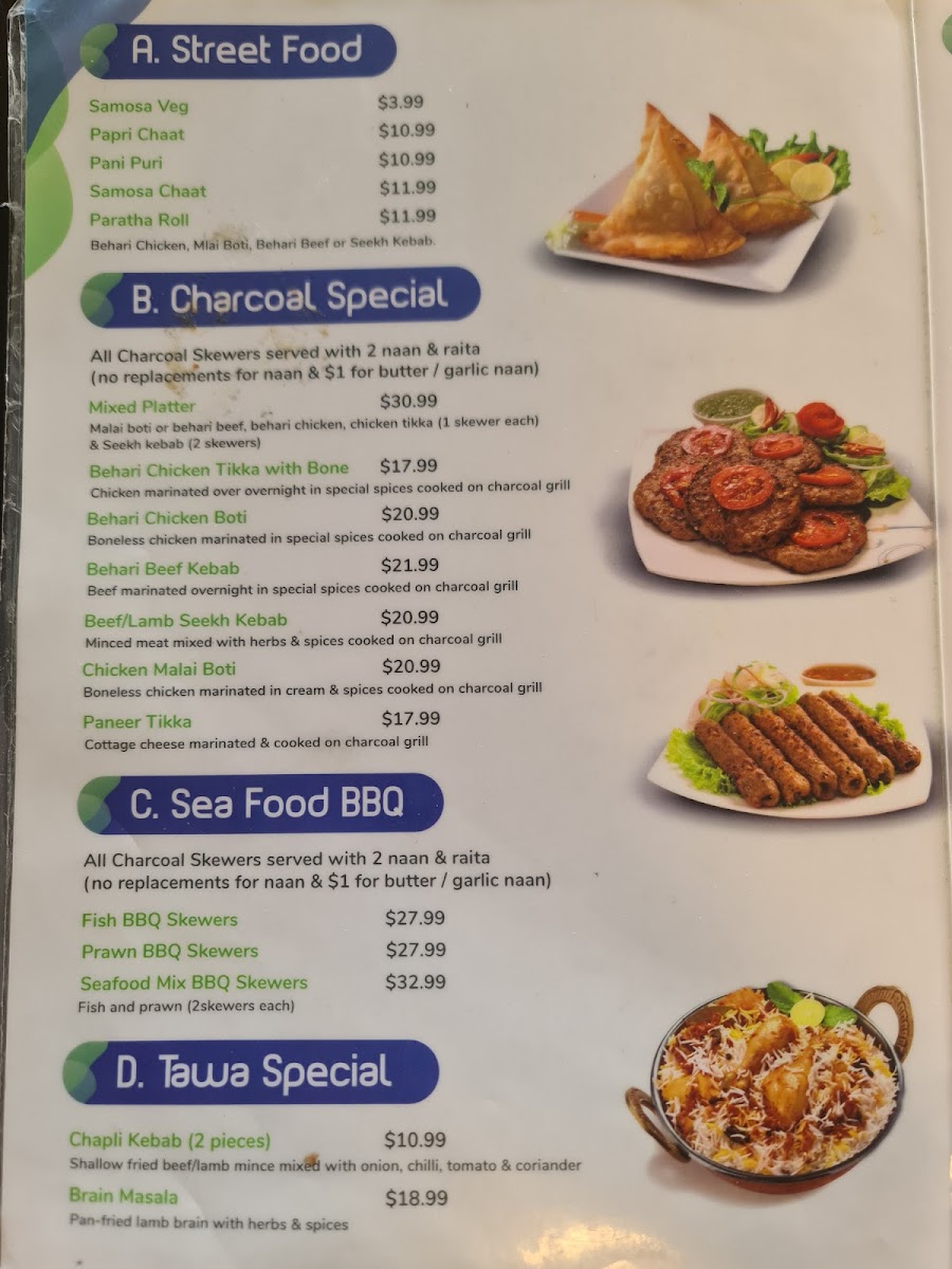 Minced meat mixed with herbs and spices cooked on charcoal grill. Charcoal skewers served with two naans, raita, and chutney.